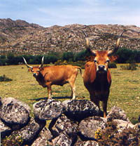 Wir trösteten uns damit, dass wir uns zu dem Bauern aus Outeiro setzten und uns unserem mitgebrachten Proviant (farnel) widmeten. Er bestand aus einer bucha (gebratenes Fleisch, geräucherter Schinken und broa, Maisbrot) durchspült von einem roten Krätzer (carrascão) aus Domingos' Lederflasche (botija). Danach ging es weiter in Richtung Nordosten zum Foralinho, einem beliebten Weideplatz an einem Bach. Als wir dort nach einer knappen Stunde ankamen, trafen wir in der Tat auf eine große Viehherde. Doch Domingos' Gesicht wurde immer länger: in der Herde befanden sich nur einige seiner Schützlinge. Die meisten kamen aus anderen Ortschaften (Parada, Pitões). Ja, es hatten sich sogar einige Damen aus Spanien dazwischengemischt, die sich schon äußerlich von ihren portugiesischen Artgenossinnen unterschieden: sie hatten ein weißes Fell und kurze schwarze Hörner.
