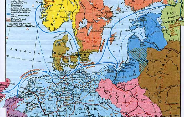 ab 1230 Formierung der Städtehanse, die genossenschaftliche Organisation der Kaufmannshansen genügte den steigenden Anforderungen nicht mehr. Kriege, Seeraub, Anarchie durch den Verfall der Reichsgewalt und Konflikte mit den Landesherren führen zu Städtebündnissen für Selbstschutz, Rechtssicherheit und Entwicklung von Handel und Gewerbe. Die Hanse betreibt die schwierige Vereinheitlichung von Maßen, Münzen, Preisen und des Stadtrechts. So fand z.B. das lübische Stadtrecht Verbreitung in vielen bedeutenden Städten des Ostseeraumes.