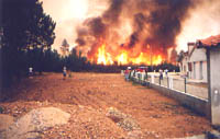 Gerade wenn ich wie Ende Oktober von den Bränden in Kalifornien höre, in einem derart reichen Land! Ich glaube, die Leute hier sind einfach besser motiviert. Die haben es dann auch geschafft, das Feuer an der Strasse aufzuhalten. Auf dieser Seite der Straße gibt es Mischwald mit Orangenbäumen und Gärten. Auf unserer Seite stehen zwei große Pinienwälder. Die waren nicht betroffen, noch nicht. Der Wind drehte ein wenig, und das Feuer marschierte weiter an der Straße Richtung Südwest, sprang dann (durch Funkenflug) auf unsere Seite, westlich von uns, weiter Richtung Nord. Dort sind durch die Sommerhitze vertrocknete Felder. Innerhalb 5 Minuten war das Feuer dann 500m weiter gekommen, es gab Explosionen, zwei Traktoren und Dieseltanks waren betroffen. Das Ganze nur 300m von uns entfernt.