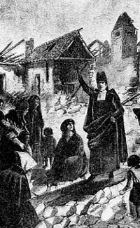 "Mal puseram pé na cidade, sentem a terra tremer-lhes debaixo dos pés; o mar ergue-se em cachão no porto e desfaz os navios que estavam ancorados; turbilhões de chamas e de cinzas cobrem as ruas e as praças públicas; as casas desabam, os telhados caem e os alicerces dispersam-se. Trinta mil habitantes, de todos os sexos e idades, ficam magoados sob as ruínas[...]