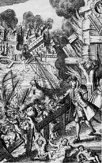 Ausschnitt eines deutschen Kupferstichs aus dem 18. Jahrhundert, der die Zerstörungen durch das Erdbeben von 1755 in Lissabon zeigt