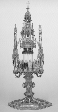 Das erlesene Werk zeigt den herkömmlichen architektonischen Stil der Epoche: Auf dem gerillten, reich dekorierten Fuß und Schaft ruht der Hostienbehälter, der von Säulen, Strebepfeilern und schlanken spitzen Türmchen umgeben ist. Darüber erhebt sich ein das Gehäuse überhöhender zweistufiger bekrönender Turmaufbau. Der segnende, ja liebevoll dreinblickende Gottvater thront an der Spitze unter einem kunstvollen Baldachin. Nicht nur das Material, sondern auch die Figurenvielfalt, wie die musizierenden Engel und die um den Behälter herum kniend angeordneten zwölf Apostel mit ihren zum Betrachter gerichteten Füßen, machen die Arbeit zu einem außergewöhnlichen Kunstwerk. Jede mehrfarbig in Email überfangene Figur ist individuell gestaltet und ähnelt den holzgeschnitzten Skulpturen eines Altarschreins. Die Technik der Emailkunst bei vollrunden Gegenständen hatte in Portugal Anfang des 16. Jahrhunderts keine Vorbilder und ist wahrscheinlich unter Mitarbeit von burgundisch-französischen Goldschmieden, zumindest unter ihrem Einfluss im Land kultiviert worden. Die Oberflächen der Plastiken sind rundum in allen Einzelheiten äußerst sorgfältig durchgearbeitet. Die genau profilierten Kleiderfalten gliedern die Figuren und stimmen in ihrem Verlauf lebensnah mit den anatomischen Gegebenheiten der Personen überein. Besondere Aufmerksamkeit schenkte der Goldschmied den gewellten Haartrachten und gepflegten lockigen Bärten.