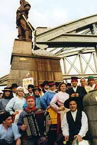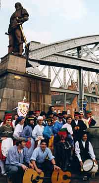 Tanz- und Musikgruppe Retalhos de Portugal Hamburg vor der Vasco-da-Gama-Statue auf der Kornhausbrücke