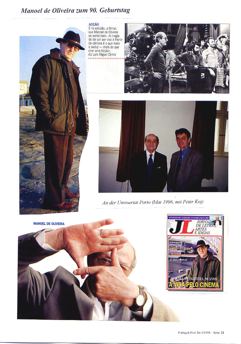 aproveito a iminência do seu 90º aniversário para lhe mandar os meus mais calorosos parabéns, também da parte da nossa associação. Nós aqui em Hamburgo - cidade, aliás, que tem muito em comum com o vosso bem-amado Porto, desde a situação geo-estratégica até ao espírito republicano dos seus habitantes - estamos a seguir muito atentamente a força creativa inquebrantável do génio do Manoel de Oliveira. Fazemos votos que essa sua força lhe ficar para criar mais algumas obras-primas cinematográficas.